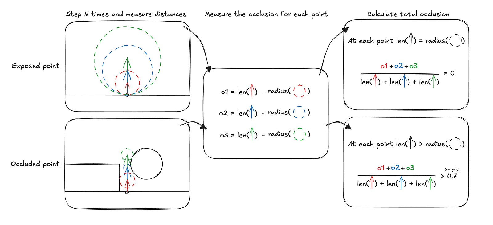 - AO (ambient occlusion) is trivial with ray marching — because of SDFs, a single ray marched a few short steps is enough for good results.