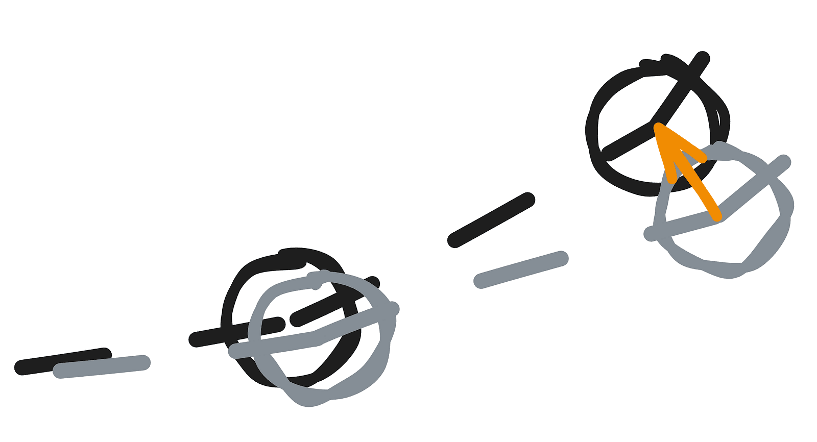 The main method used for calculating point positions is Verlet integration, which — despite its intimidating name — is actually very simple. We can think of it this way: if a point was previously at position A and is now at position B, its velocity corresponds to the vector from A to B.