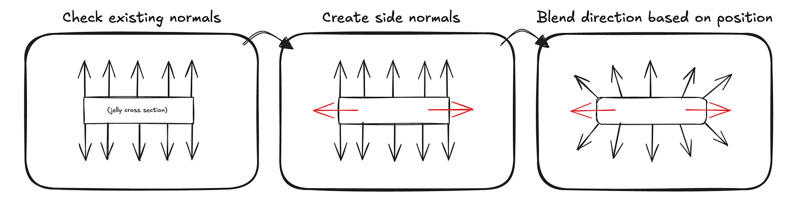 Calculating normals using three points is straightforward: we take the line defined by connecting the previous and next points and then compute a vector that’s perpendicular to it. For the edge cases — the first and last points — we can simply assume the normal points straight up.