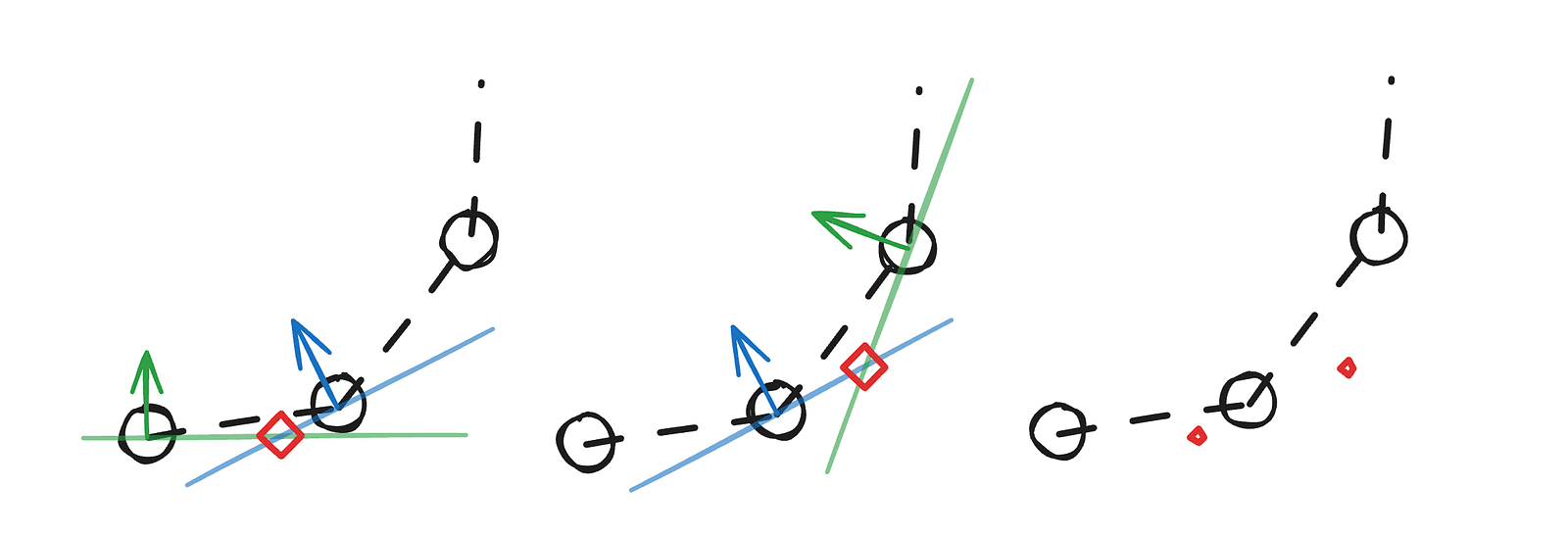We already have a list of points for the slider, but we still need a third point for each segment to form the curves. This is where normals help. By using them, we can derive tangent lines, and the intersection of the tangents between two consecutive points gives us the control point for that segment.