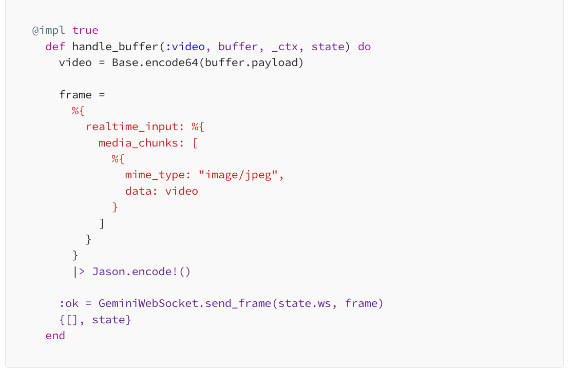 The H.264 video is parsed and decoded, then re-encoded as JPEG. This ensures that the GeminiEndpoint receives JPEG buffers, which is exactly what we need to send to the Gemini API: