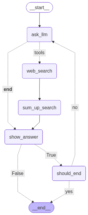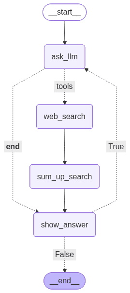 If a tool is needed, it’s executed, and the LLM summarizes the results; if not, it goes straight to providing the answer. Then, the iteration limit is checked, and the loop continues or ends.