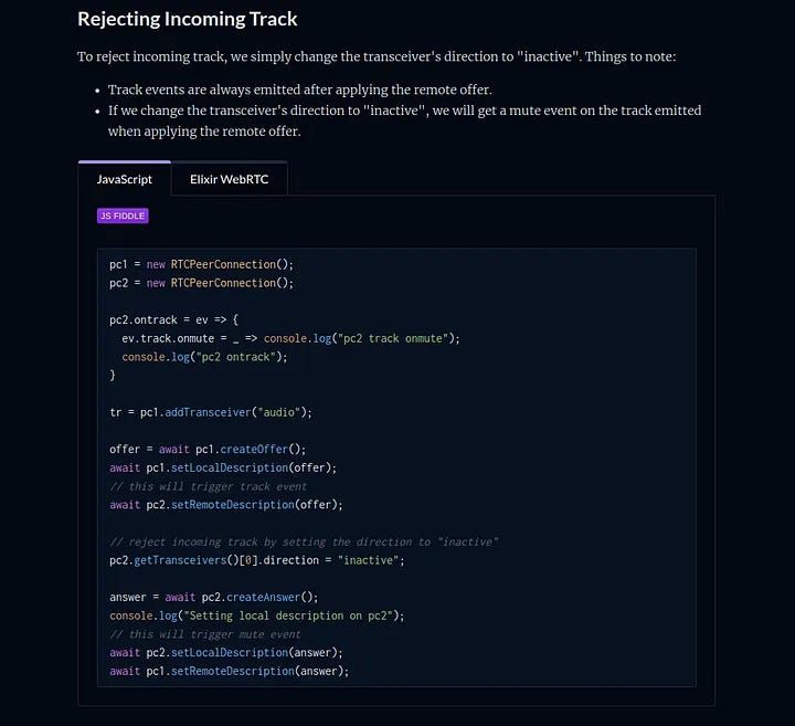 We wanted to gather all of that knowledge somewhere, and the first step in that direction is the Mastering Transceivers guide. It consists of a series of examples explaining some tips and tricks for WebRTC’s Transceivers. Each example contains both JS (you can quickly run it in the browser and experiment with it, all thanks to the JS Fiddle!) and Elixir snippet, which makes it easy to understand how the browser API maps to ours. We hope to add Livebooks for the Elixir code in the future!