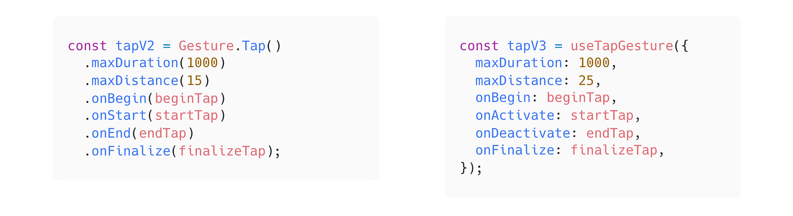 If you have been using Gesture Handler so far, the new API will look familiar, but with some significant changes. The most noticeable ones are the renamed callbacks — onStart becomes onActivate, and onEnd becomes onDeactivate. The new names align more closely with the gesture state flow.