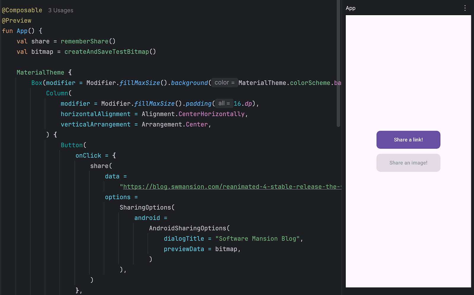A universal sharing function for Compose Multiplatform. It uses the Android Intent system and iOS UIActivityViewControllerto provide a native experience. Various customization options, like personalizing the title of the thumbnail, are also available.