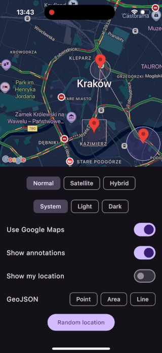 A universal map component for Compose Multiplatform applications, offering seamless integration with native map APIs on both Android and iOS platforms. It uses Google Maps SDK on Android and Apple Maps (MapKit) on iOS. We also added Google Maps support for iOS, the possibility to display GeoJSON data, and custom markers are on their way. The location permission handling is built in, and user interactions like clicks, camera movements, and gestures are handled.