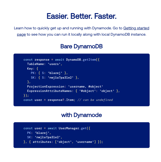 Błażej Kustra•Oct 4, 2023•6 min readAmazon’s DynamoDB is an exceptional NoSQL database, famous for its scalability and performance. But let’s spill the tea here: while it’s a fantastic database service, operating on DynamoDB through AWS SDK can be about as user-friendly as a cactus. 😅