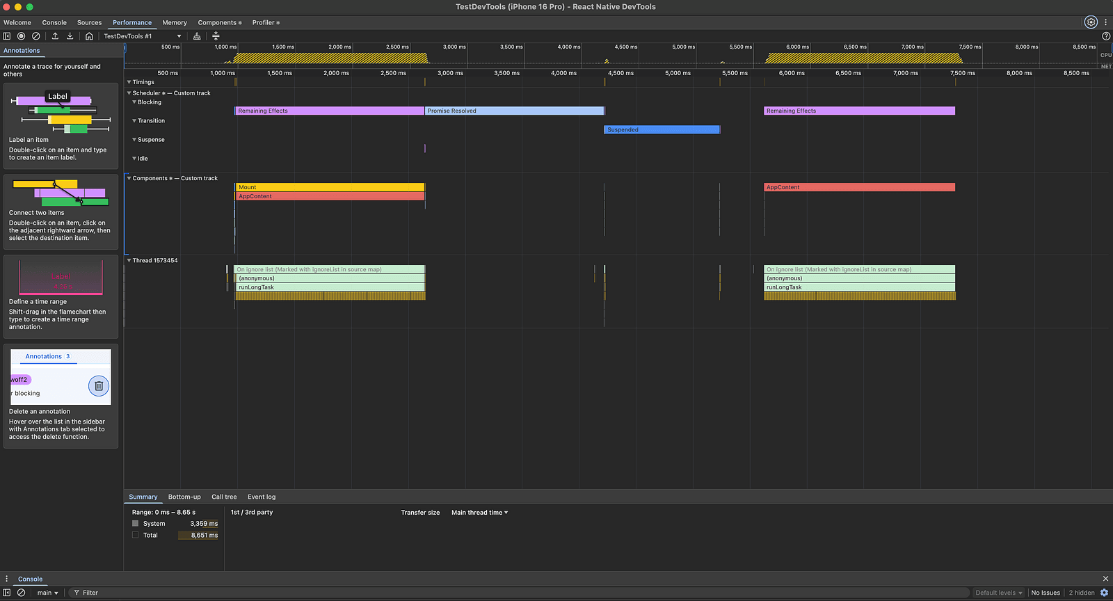 Since React Native 0.76, we can use React DevTools with its UI based on Chrome DevTools. Until now, DevTools have been used primarily for viewing logs (Console), inspecting memory usage (Memory), exploring the component tree (Components), and — most importantly — using the React Profiler to track component re-renders across the application. With React Native 0.83, there is a new feature coming: the Performance panel.
