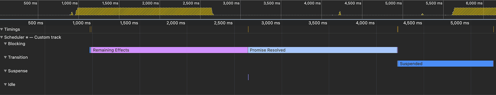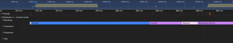 In each of the tracks, we can follow the exact React activity. Usually UI updates are divided into five phases: