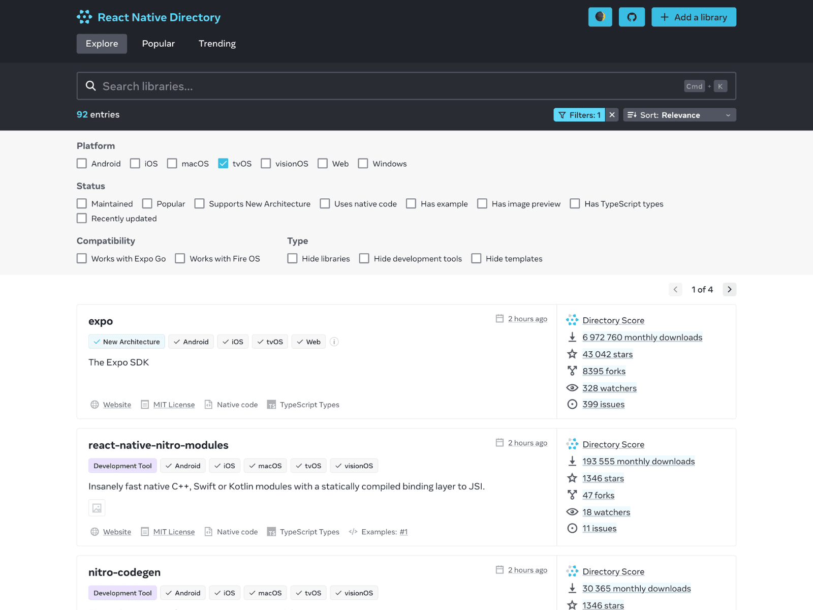 To check the compatibility of a given library with your desired TV platform, visit https://reactnative.directory, and enable TV platforms filters (tvOS or Works with FireOS).