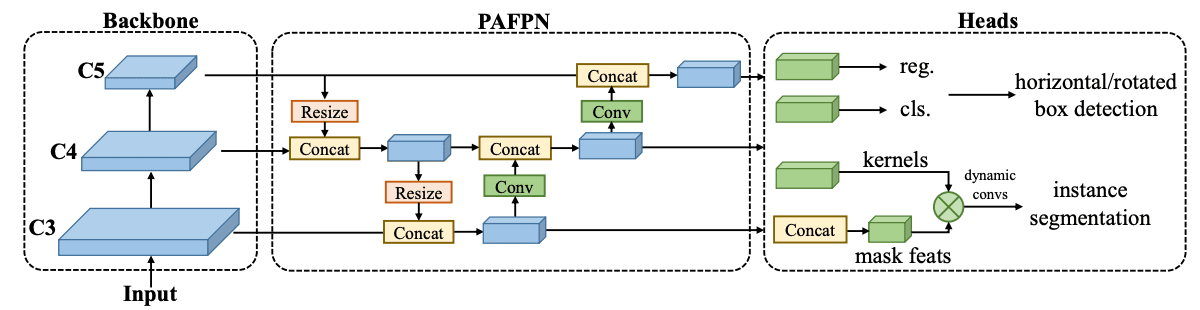 - The head processes the embedded information from the neck and generates the desired outputs. In the RTM_DET_INS model, a custom head is utilized for this purpose.