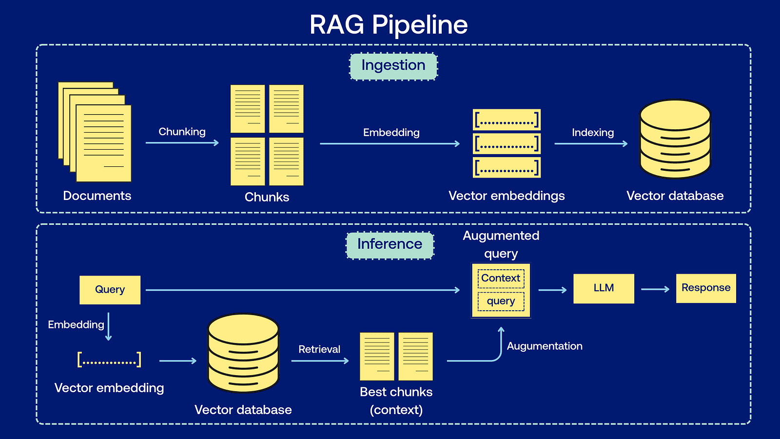 RAG consists of two main stages: the ingestion stage, where documents are prepared for retrieval, and the inference stage, where the user interacts with the model.