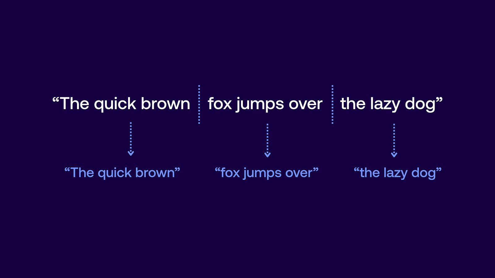For example, you could split it every three words, which would result in chunks: “The quick brown”, “fox jumps over”, “the lazy dog”.