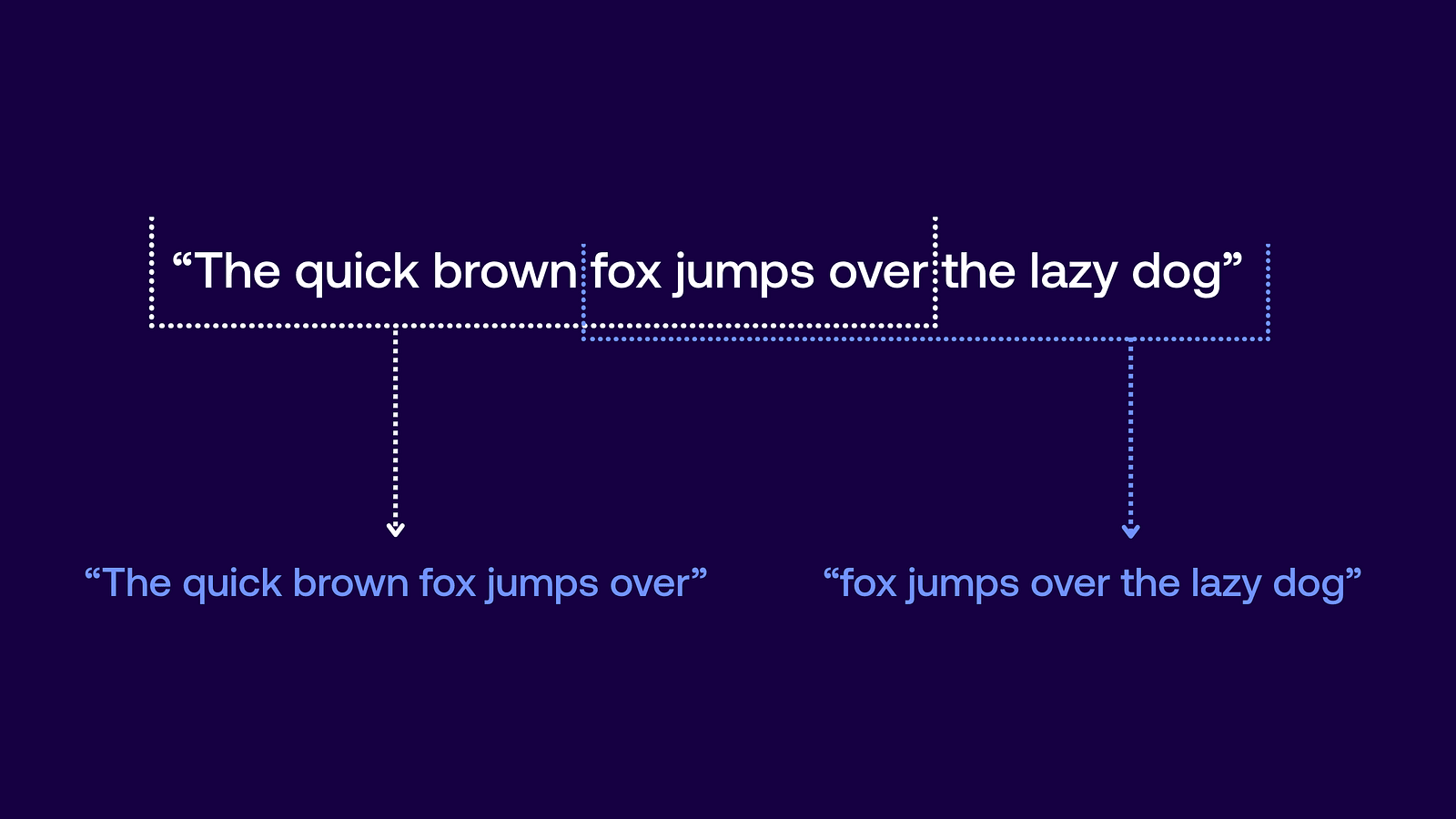 However, when splitting text, we can’t be sure we’re dividing it at the right points to separate sentences by meaning, so we use overlapping segments as a precaution. If we split the sentence into six-word chunks every three words, we would end up with sentences: “The quick brown fox jumps over”, “fox jumps over the lazy dog”.