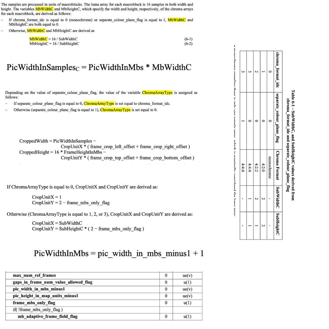 2. Derived fields: Found across various sections of the specification (also noted within lines of the Syntax Tables in section 7.3). These fields, named in PascalCase, are calculated based on the values of other fields, including both bitstream and derived fields. Examples of these fields are CroppedHeight and ChromaArrayType. For these fields, I needed to obtain: