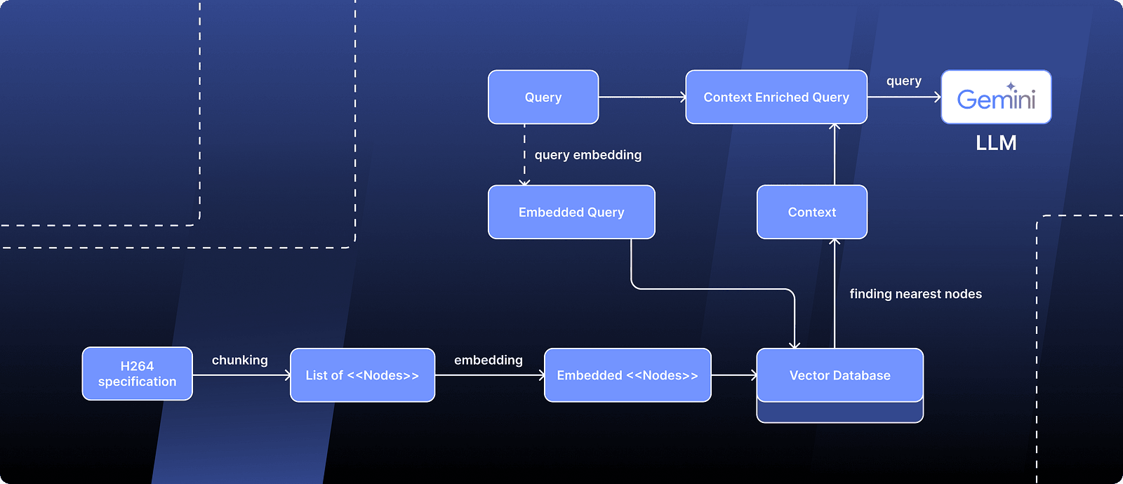 In a typical RAG fashion, I divided my input into multiple “Nodes.” I then transformed each node into a vector and stored these in a vector database. When I had a query for the LLM, I first turned the query into a vector too. Next, I searched the database for vectors close to my query (meaning they’re likely relevant) and used these vectors to add more context to my query, helping the LLM understand better what I was looking for.