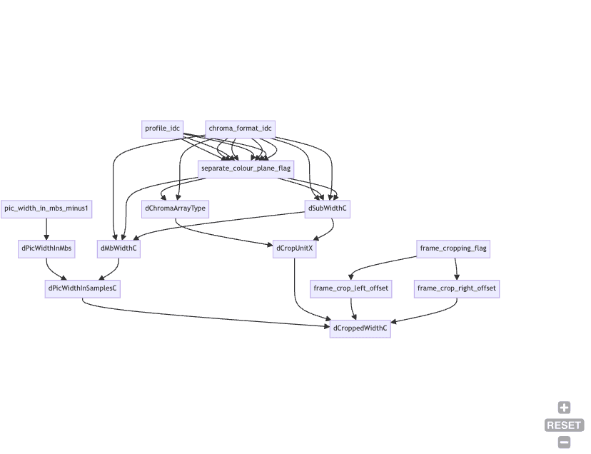 Figuring out how to calculate H.264 frame resolution was precisely the challenge I was given in late autumn of 2021, which was also my first exposure to the H.264 specification. Since that time, I’ve revisited various sections of the specification multiple times, somewhat increasing my understanding of it (I’ve even written a brief tutorial as an introduction to the H.264 codec!). But, despite my better familiarity with the codec, I still thought that having a tool capable of automatically resolving dependencies between the fields would be incredibly useful.