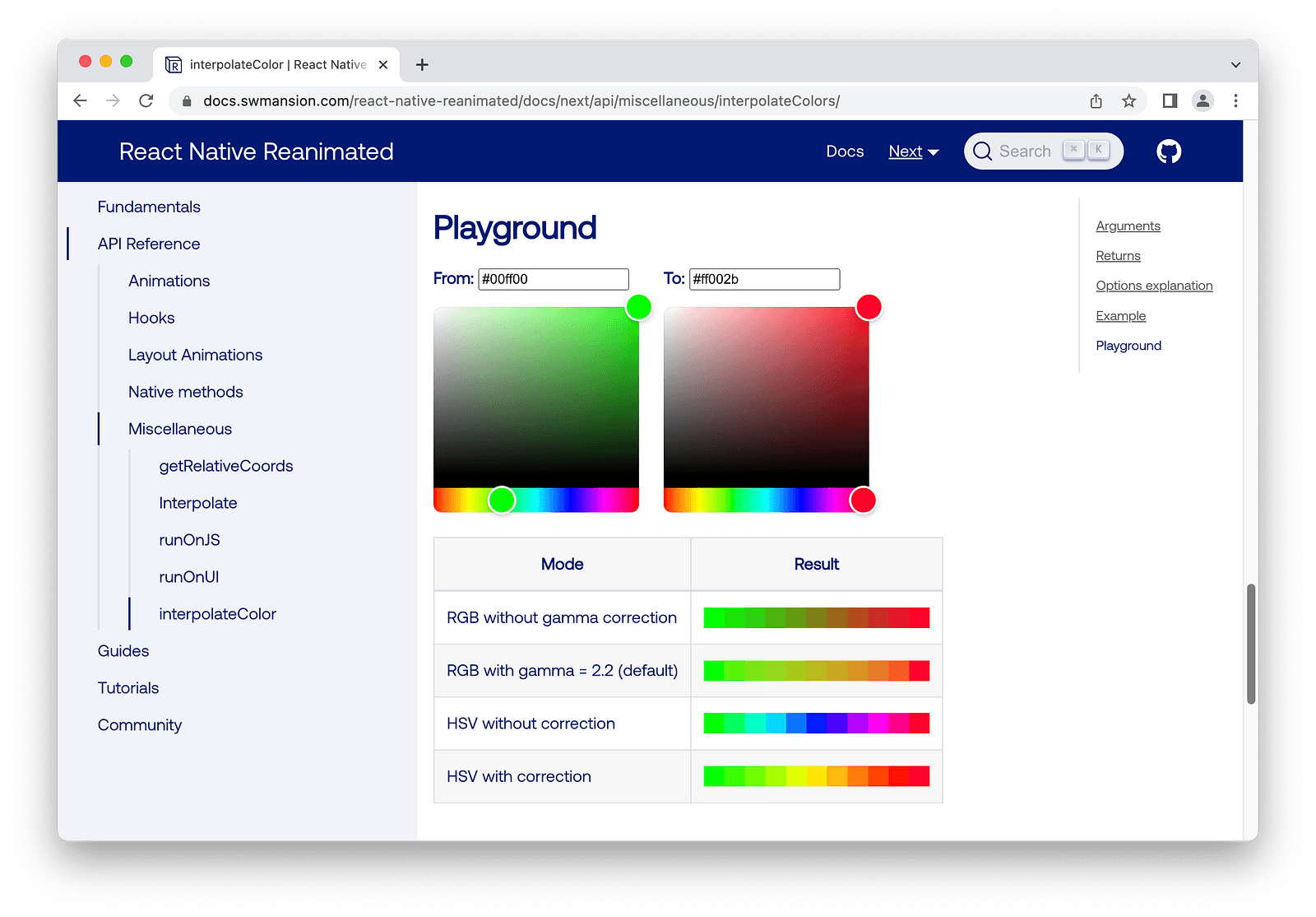 Reanimated comes with built-in support for animating and interpolating colors in various formats, just like they were regular values. Previously, animating from red to green or cyan would take you on a long but quite colorful journey through the whole rainbow but unfortunately in most of the use cases this isn’t actually the desired result. Starting from Reanimated 3.0.0-rc.10, you can choose from 4 different interpolation modes, with RGB with gamma = 2.2 being the default since such transition looks the most natural to the human eye (check out the interactive demo in our docs).