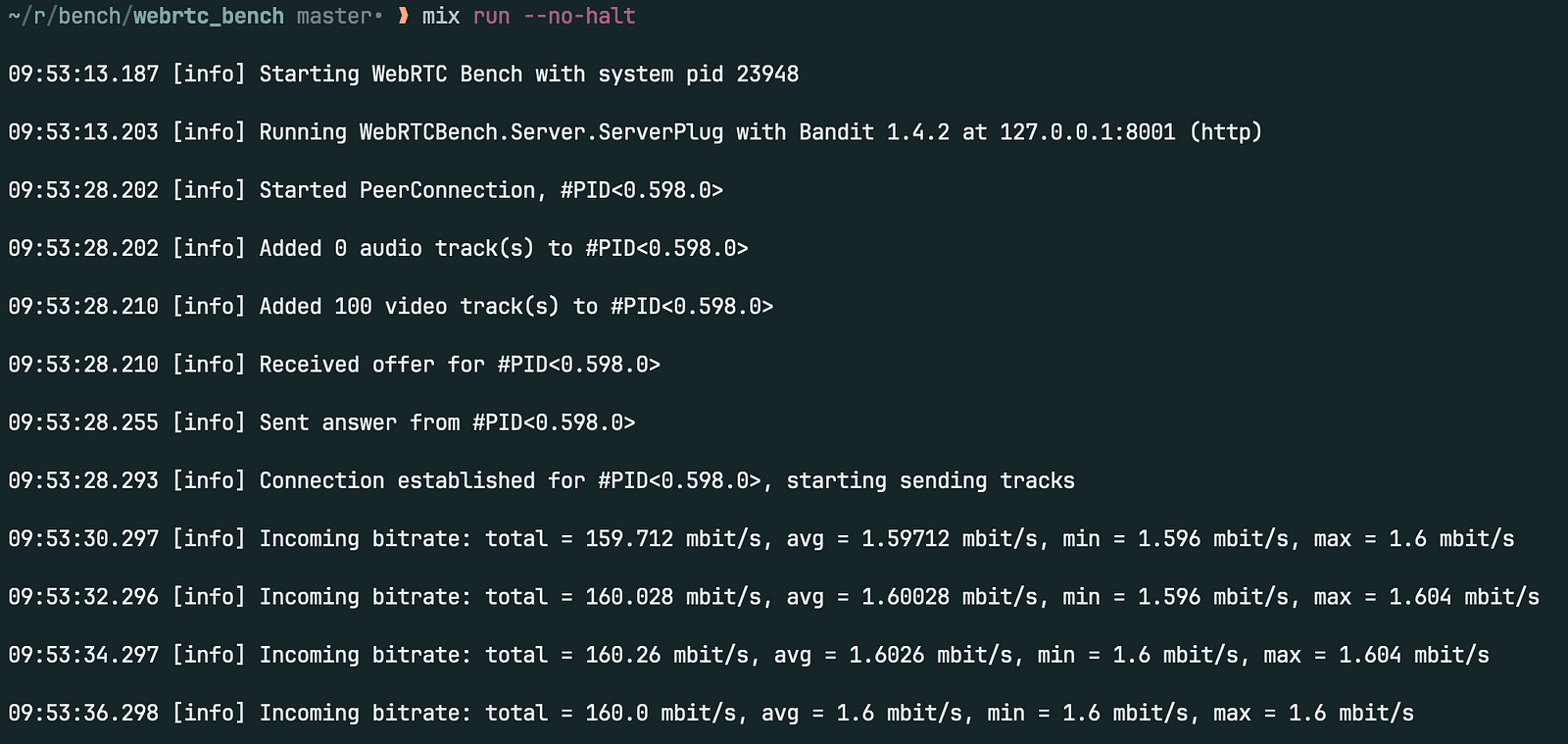 Remember that this is only a single PeerConnection, in a typical videoconferencing scenario you’d have a PeerConnection per participant. Even in big meetings (>100 participants) a single user usually receives 20–30 tracks (or how many video tiles an app can fit in a single view) simultaneously, and at that point, the performance of a single PeerConnection probably won’t be the issue to care about. Because of that, this metric is not immediately useful, but you can create a rough estimation of how the Elixir WebRTC could perform when used in the videoconferencing scenario e.g. as an SFU.