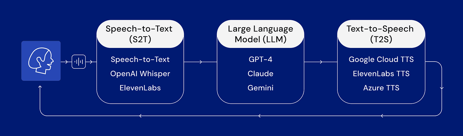 - Large Language Model (LLM): The transcribed text is processed by an LLM (e.g. Gemini, GPT-4, Claude) to understand the context and generate an appropriate text response.