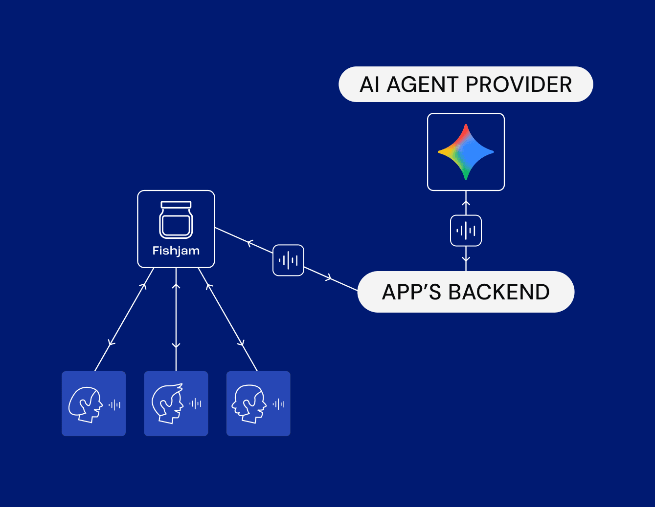 - The bridge: When the game starts, the backend creates a Fishjam Agent. This agent acts like a “ghost peer” in the audio-video room; its sole purpose is to capture audio of the players and forward it to the AI, and vice versa.