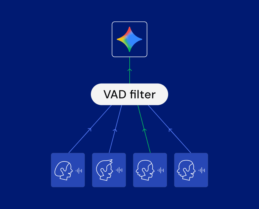 - Server-side filtering using VAD: In this approach, we implemented a centralized gatekeeper using Voice Activity Detection (VAD). We wait for a player to speak, lock the “input slot” and forward only that specific player’s audio to the AI agent. Once they stop speaking, the lock is released, allowing another player to ask questions. This is the solution we finally went with.