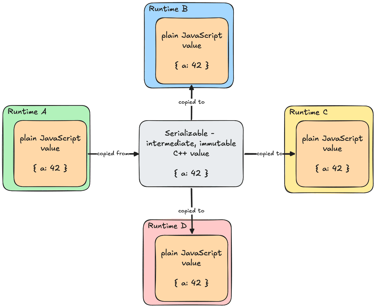 The simplest of them all, a way to move any value from Runtime A to Runtime B as-is: a number, an object, a string, basically everything that makes sense. However, changes to such a value on any Runtime aren’t reflected in the other Runtimes. Each Runtime is unaware that it has a copy and simply treats its value as the original. This is the Serializable. Depending on the definition of shared memory, this type might not even be considered one.