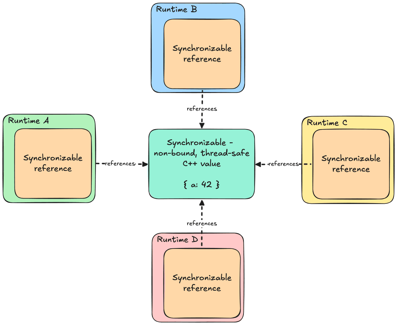 The first type of memory that is actually shared — meaning that changes to it on Runtime A will be seen by Runtime B and all the other Runtimes. This is achieved by keeping the actual “real” value outside of any Runtime, in C++, guarded by mutexes and other thread-safe mechanisms. Each JavaScript Runtime holds just a specific kind of reference to the C++ value. Each read or write means crossing the boundary between JavaScript and C++. Because the memory is thread-safe, each Runtime can safely access it at its own discretion. This is the Synchronizable
