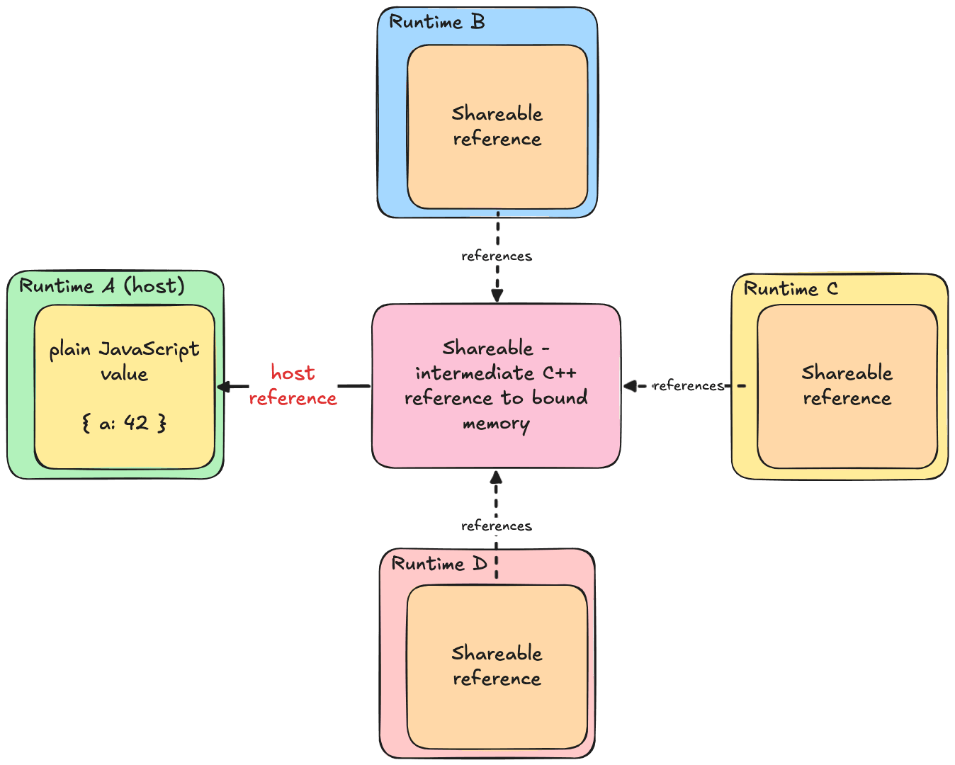 Type of asymmetric shared memory that overcomes some issues of unbound memory — operations on unbound memory are much more expensive than ones on plain JavaScript values — due to the need to cross the boundary between JavaScript and C++ with JSI on each access. Runtime-bound memory optimizes access time on a single designated JavaScript Runtime, called the Host Runtime, by simply holding the value there as a plain JavaScript value. Other Runtimes only have a specific kind of reference that “knows” that the actual value lives on another Runtime — if you want to access it with that reference, you must go to C++, obtain the Host Runtime exclusively, read the actual value, and return it all the way back to the accessor Runtime. This is the Shareable, the spotlight of today’s blogpost.
