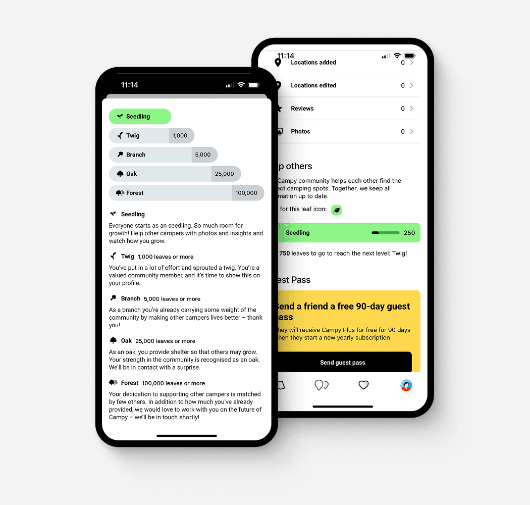 To improve app retention, we built a gamified system where users earn "leaves" for any user-generated content like reviews, photos, or campsite details. When they contribute, the leaves grow into trees, and for the most active users, into entire forests, encouraging more contributions.